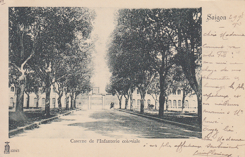 " But what really draws attention is the majestic avenue leading to the entrance of the barracks. The location is Saigon, and according to the date inscribed in the upper right corner : December 29, 1903, confirmed by the postmark on the back of the card, the view was taken before 1903.
