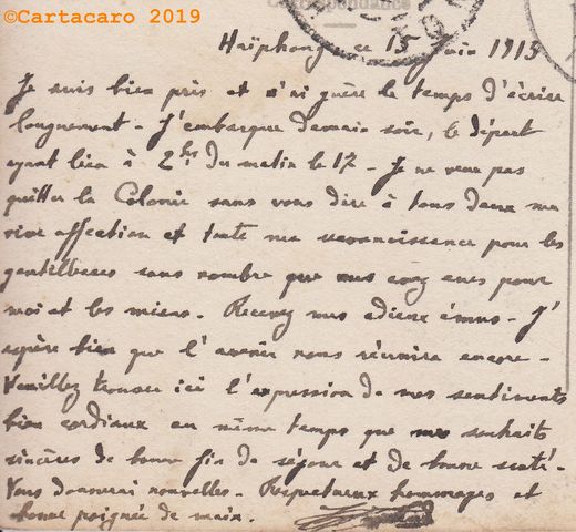 Je suis bien pris et n’ai guère le temps d’écrire longuement. J’embarque demain soir, le départ ayant lieu à 2 heures du matin le 17. Je ne veux pas quitter la Colonie sans vous dire à tous deux ma vive affection et toute ma reconnaissance pour les gentillesses sans nombre que vous avez eues pour moi et les miens. Recevez mes adieux émus. J’espère bien que l’avenir nous réunira encore. Veuillez trouver ici l’expression de mes sentiments bien cordiaux en même temps que mes souhaits sincères de bonne fin de séjour et de bonne santé.